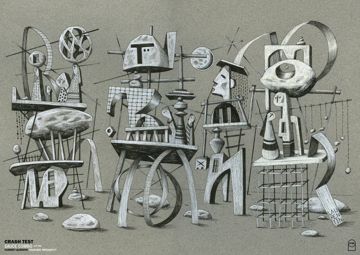The brilliant illustration of Clément Laurentin's "Equilibre Précaire VI" achieves this album, offering a paint showing four figures at the edge of the fall, in a constant imbalance, playing with time and gravity. It's the perfect allegory for the three band's members plus the engineer while making this record. Designed in the tradition of the great jazz covers, it registers the album in the continuity of the bests.